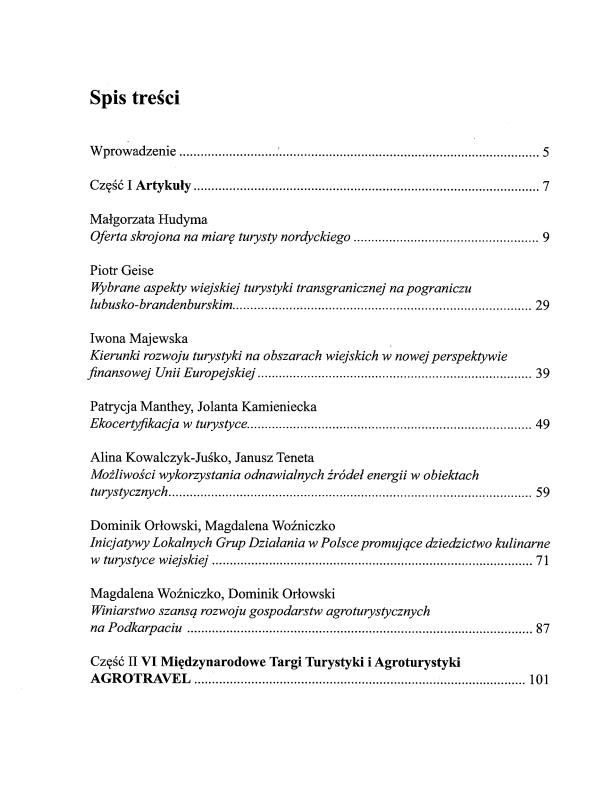 Niniejsza publikacja jest plonem wystąpień, warsztatów i dyskusji. Zebrano w niej referaty wygłoszone podczas trzech sesji plenarnych, podczas których omawiano m. in. możliwości wsparcia działań podejmowanych na rzecz turystyki wiejskiej, w tym agroturystyki, potencjał turystyki wiejskiej i jego wykorzystanie w rozwoju obszarów wiejskich, dobre praktyki jako inspirację do działań na rzecz tworzenia programów rozwoju turystyki wiejskiej i agroturystyki.