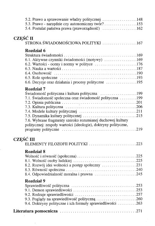 Przedmiotem prezentowanej pracy jest wprowadzenie do szeroko rozumianej, wielopłaszczyznowo ujętej, teorii polityki, wprowadzenie obejmujące podstawowe instytucje polityczne (władzę, państwo i prawo), stronę świadomościową polityki (wraz z kulturą polityczną) oraz elementy filozofii i polityki (problem wolności, równości i sprawiedliwości politycznej).